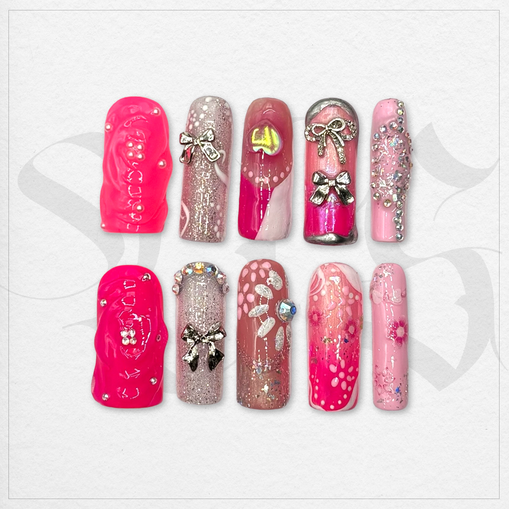 Each Package Includes 10 Hand painted nails, a mini file and nail glue, a mini buffer block, and a orange stick!